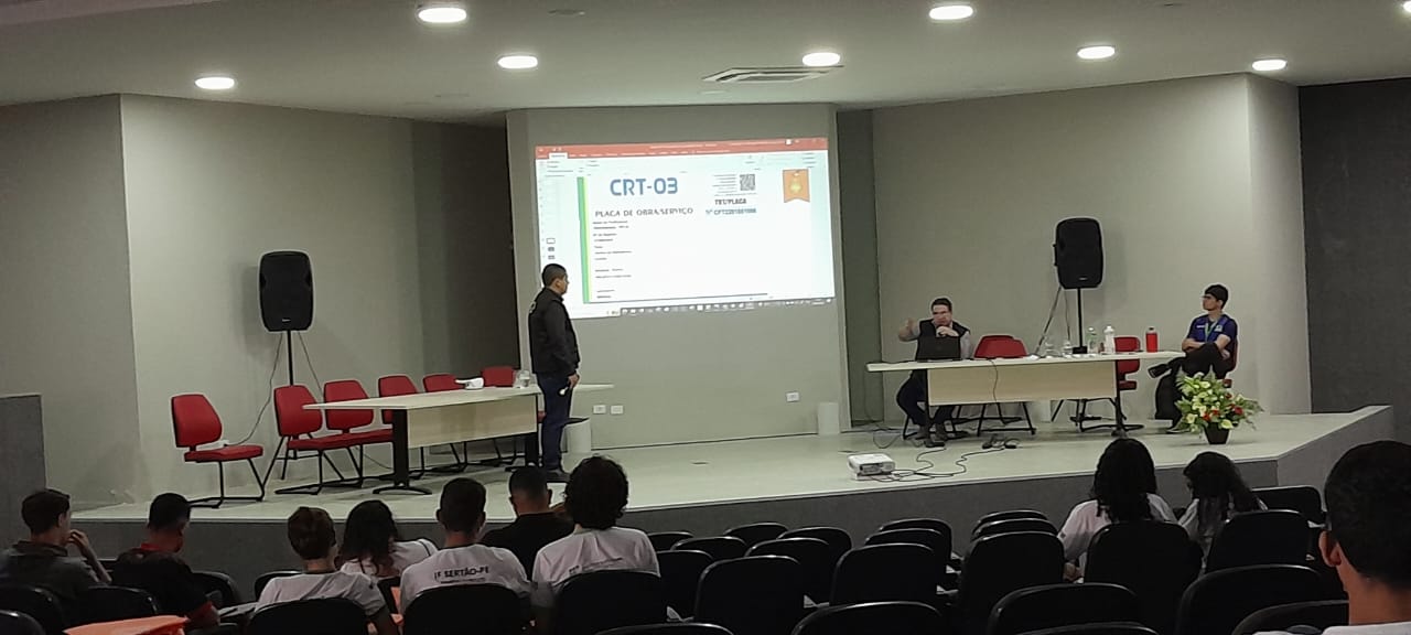 O Diretor e o Gerente de Fiscalização do CRT-03 Antônio Urbano estiveram no IF Sertão, campi Ouricuri na IV Semana do Técnico em Edificações, levando para mais de 100 jovens as informações sobre o conselho. Estiveram presentes ao evento o Diretor de Ensino Alcidenio Soares Pessoa e o Diretor geral Paulo Alvacely Alves Ribeiro Junior.
